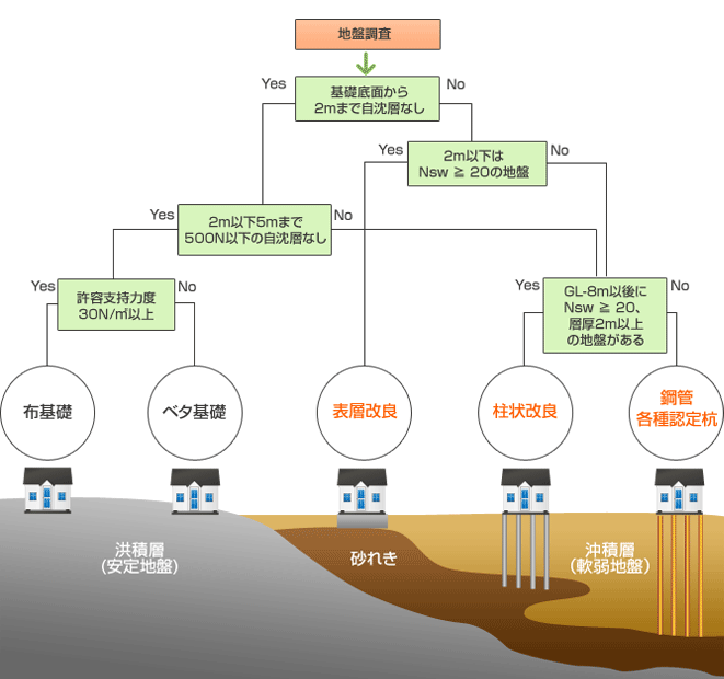 * 地盤調査を実施し、その地盤に最適な改良工事方法を検討します