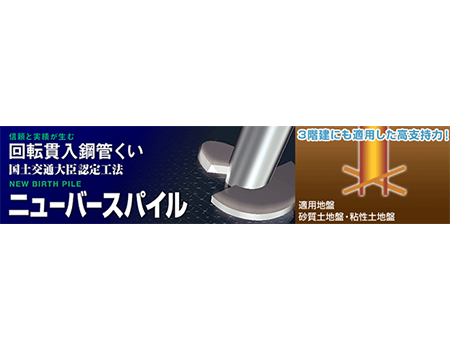 ニューバースパイルは、回転させることで鋼管杭を地中に貫入させる、国土交通大臣認定の小口径鋼管杭工法です。独自のスクリュー形状により、高い支持力を発揮するとともに、残土が極めて少ないことが特徴で、環境への配慮も実現しています。狭小地や都市部での地盤補強工事にも適しており、低振動・低騒音で迅速な施工が可能です。東京・神奈川の住宅や店舗などの地盤沈下対策として多数採用されています。